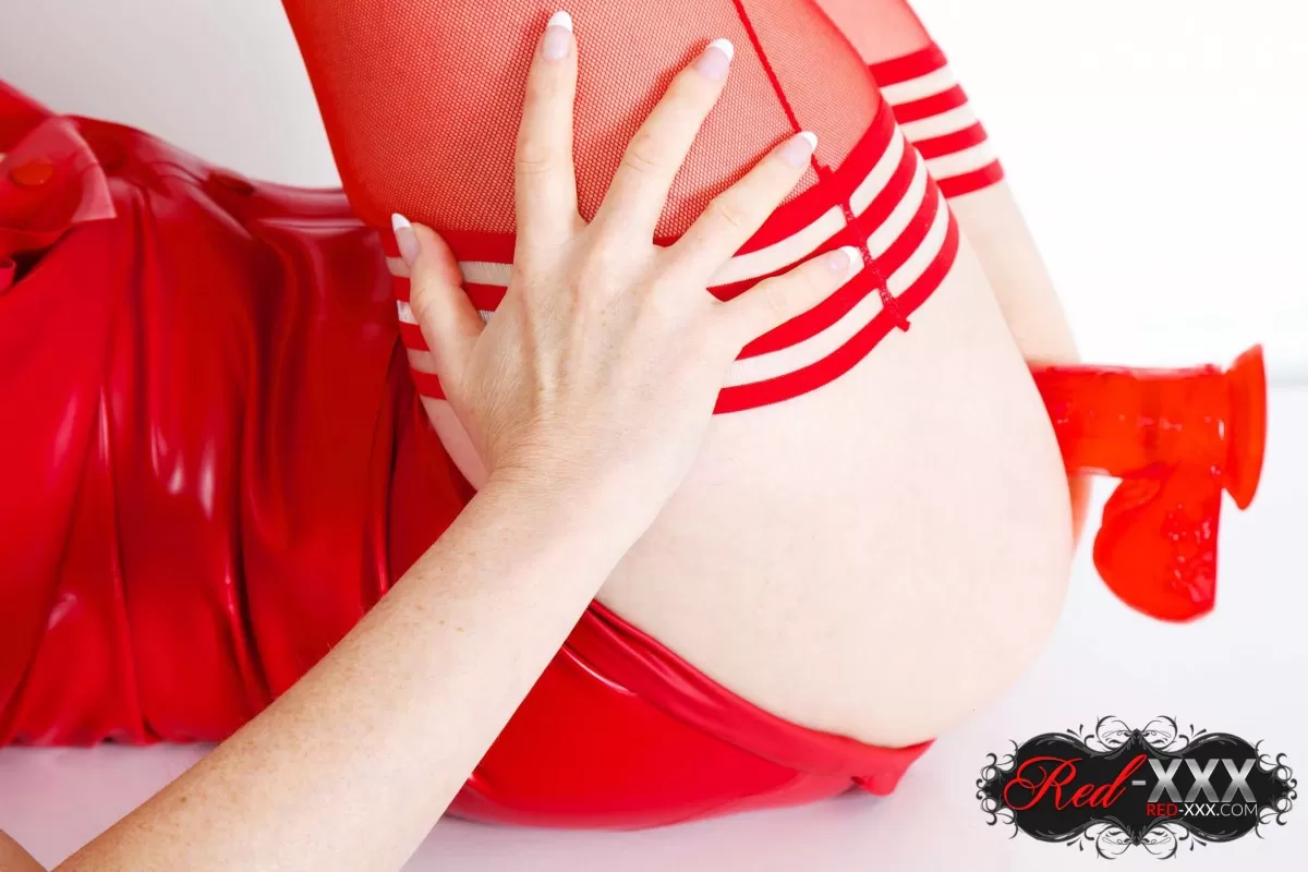 Бледно-рыжая девушка вставляет красный фаллоимитатор, одетая во все красное