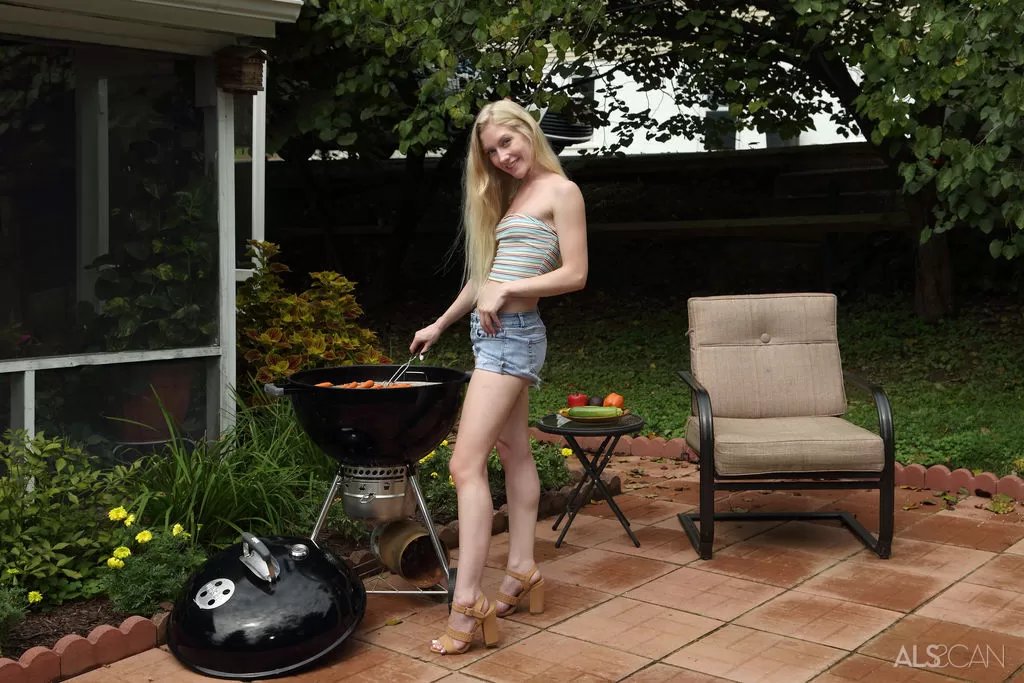 Блондинка-любительница Эмма Старлетто засовывает огурец в свою киску во внутреннем дворике