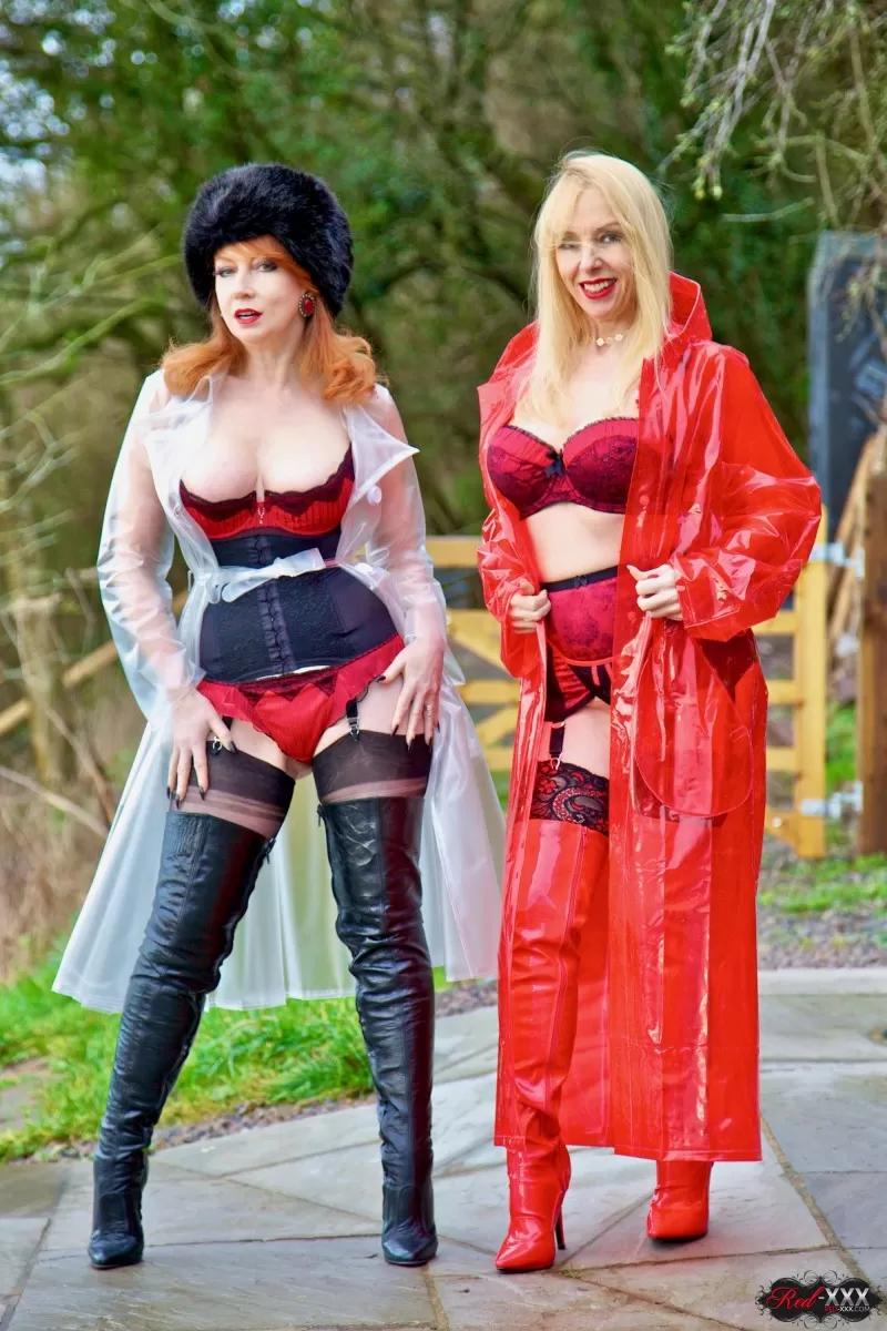 Британские лесбиянки обнажают сиськи, моделируя плащи и сапоги до бедер