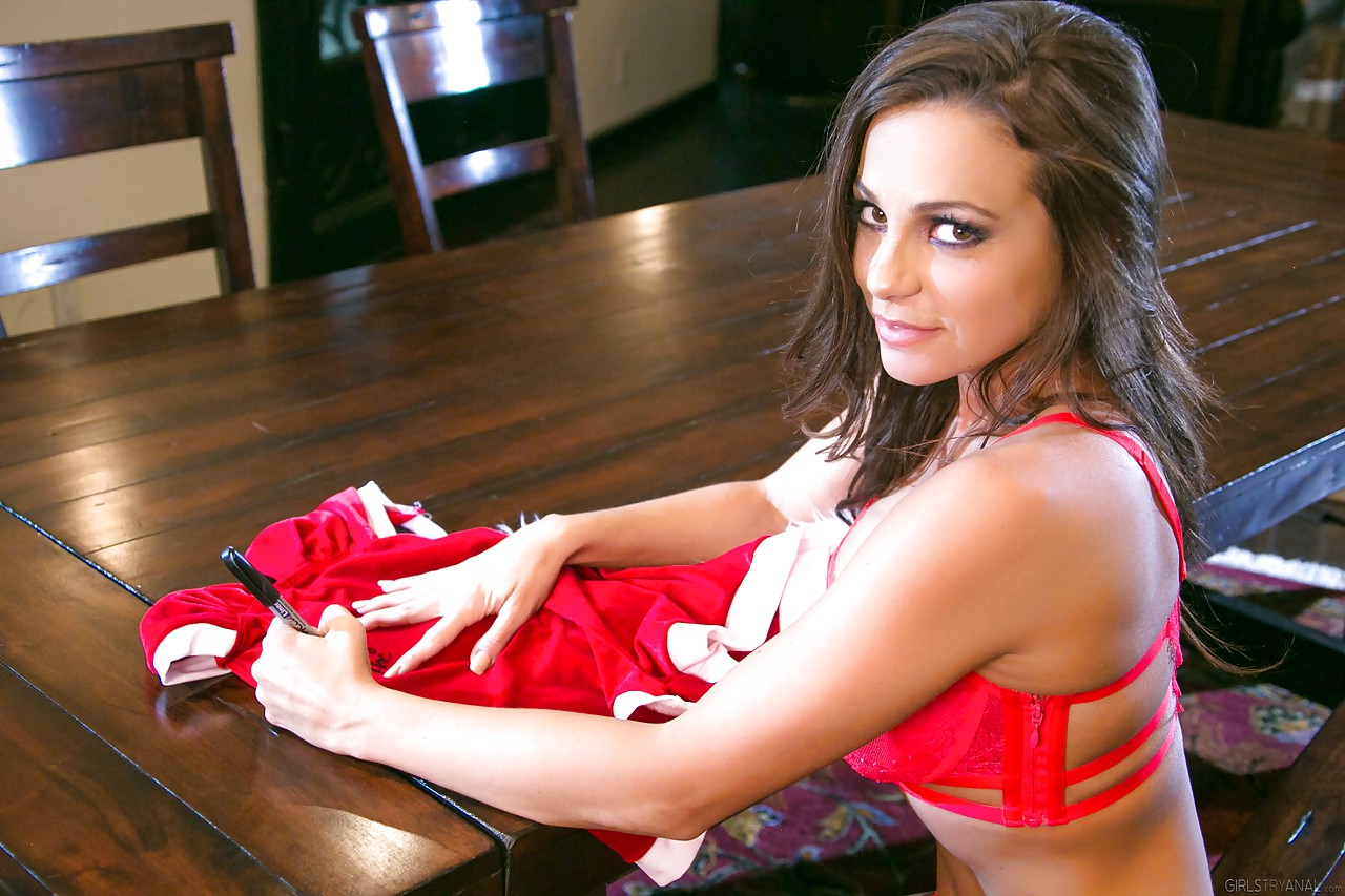 Брюнетка Эбигейл Мак снимает рождественское нижнее белье, чтобы показать маленькие твердые соски