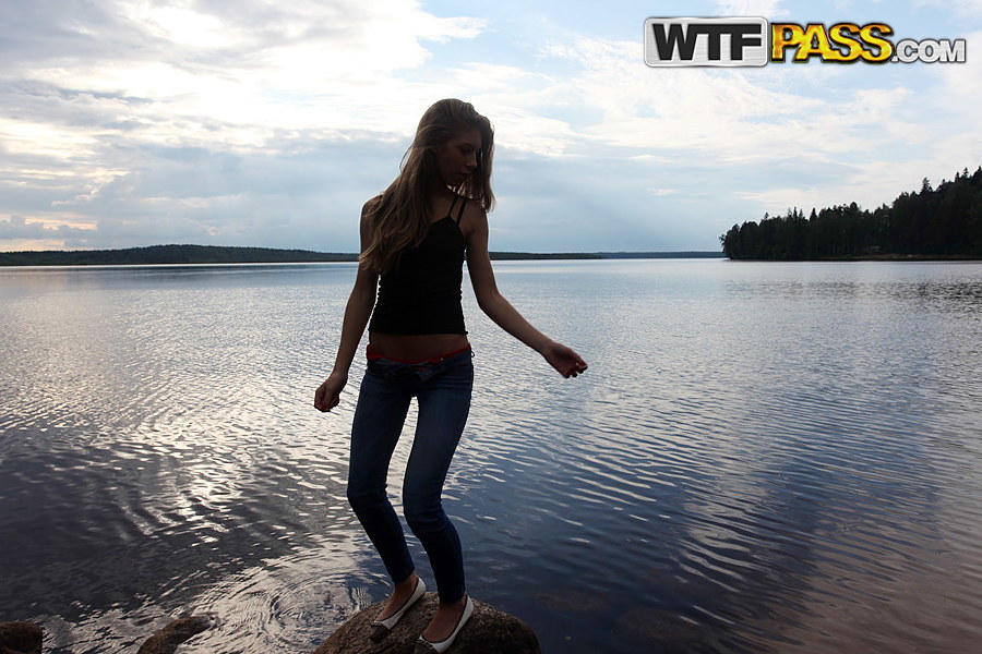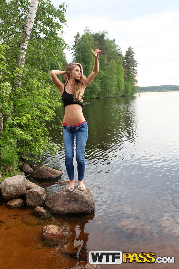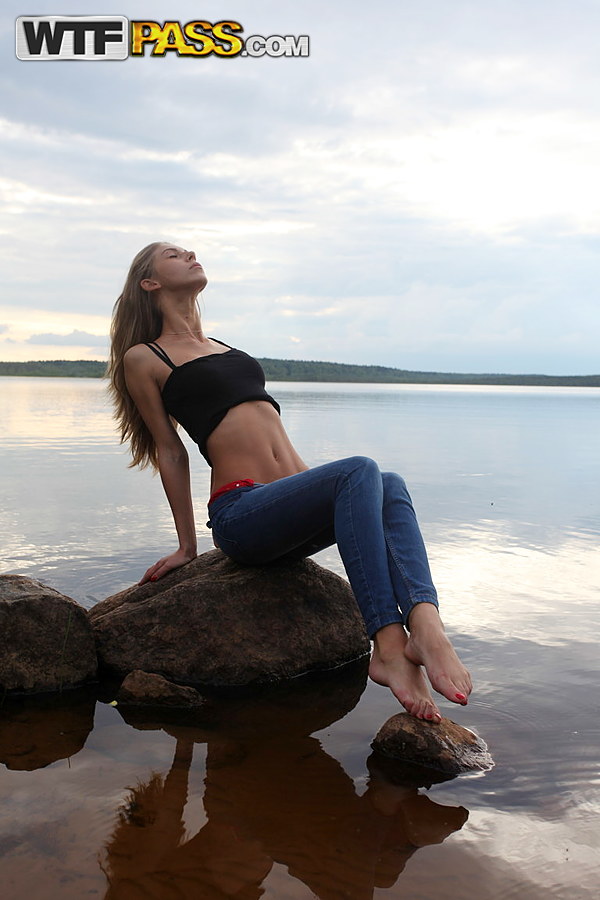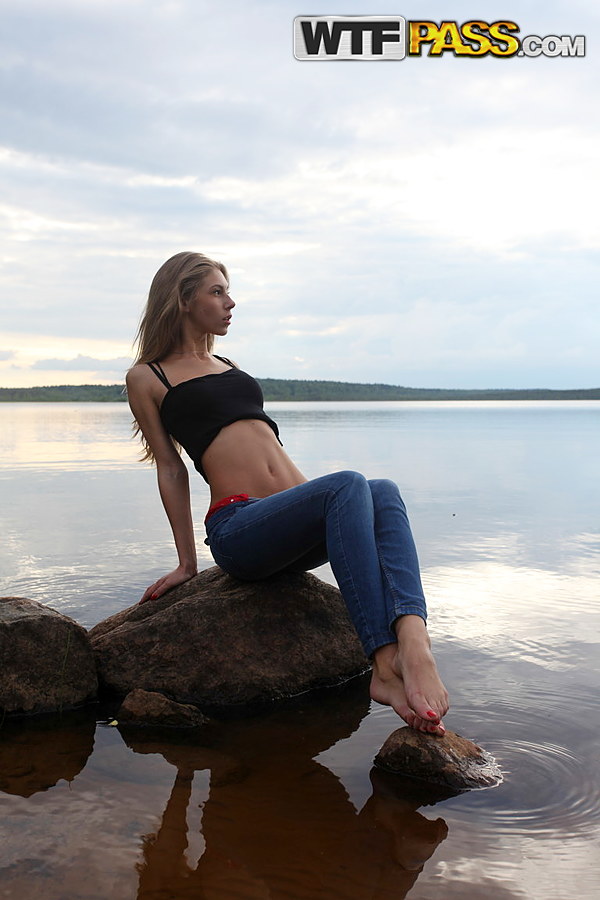 Девушка по соседству Меган показывает свои сиськи, сидя на камне в озере