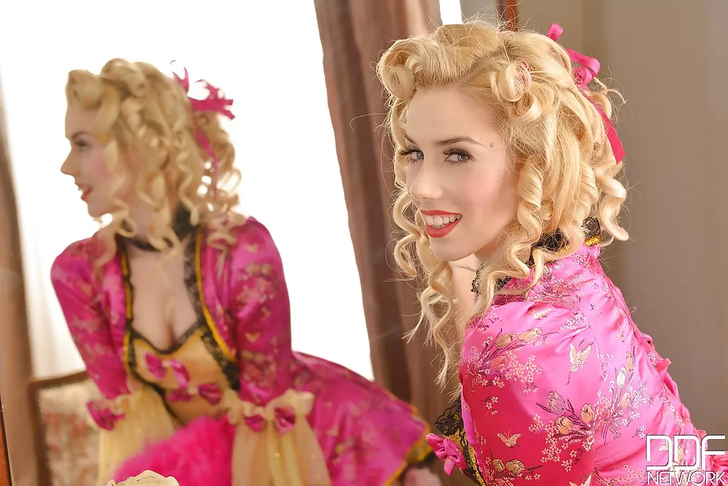 Горячая блондинка отодвигает винтажные трусики в сторону, чтобы показать крупным планом розовую пизду