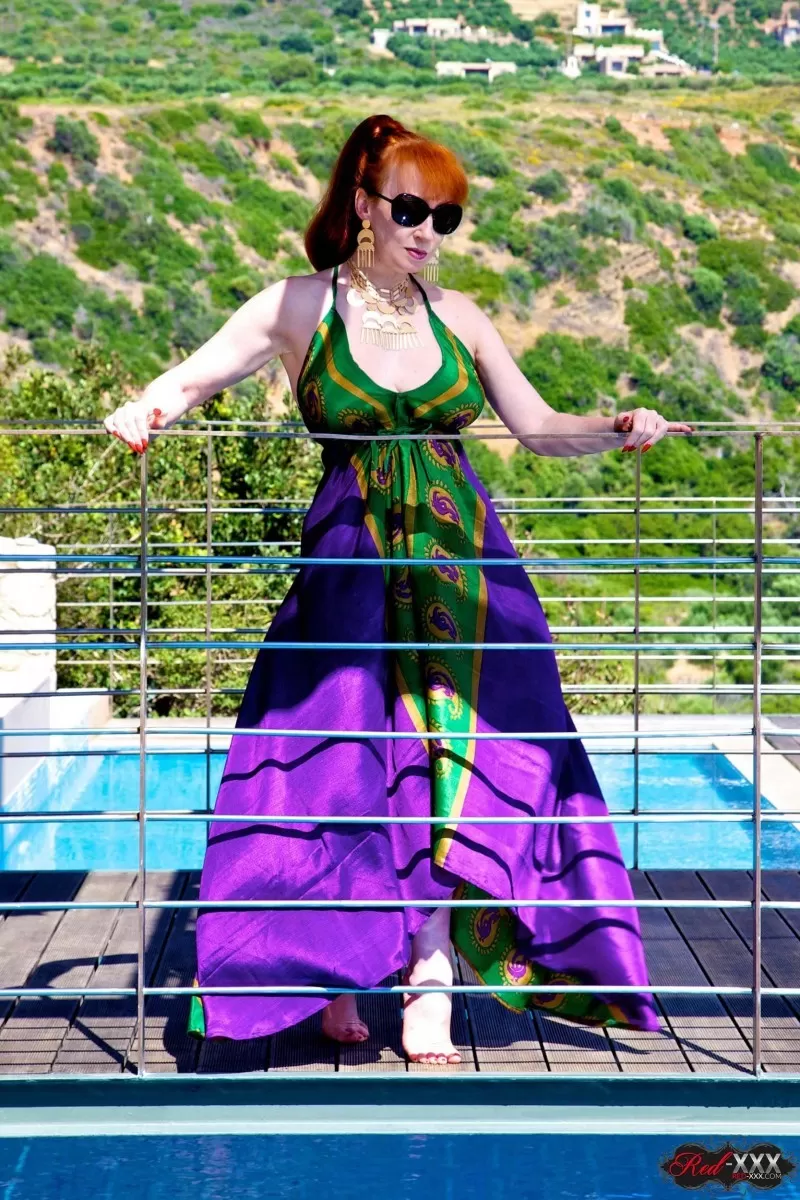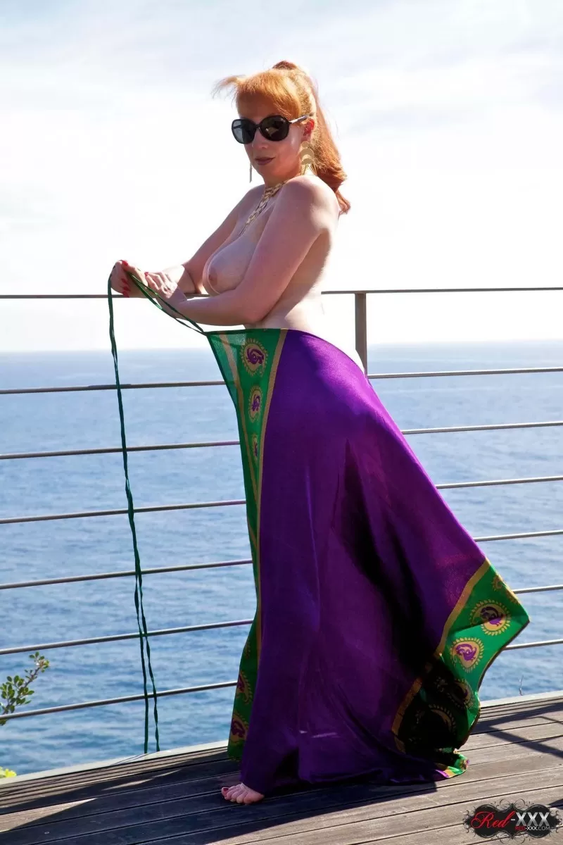 Грудастая соло-модель Red XXX играет со своей киской во внутреннем дворике на крыше с прекрасным видом