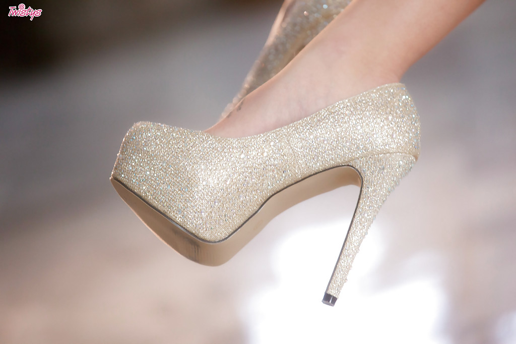 Красотка на высоких каблуках Кали Роуз задирает ноги, сидя на стуле, показывая пизду