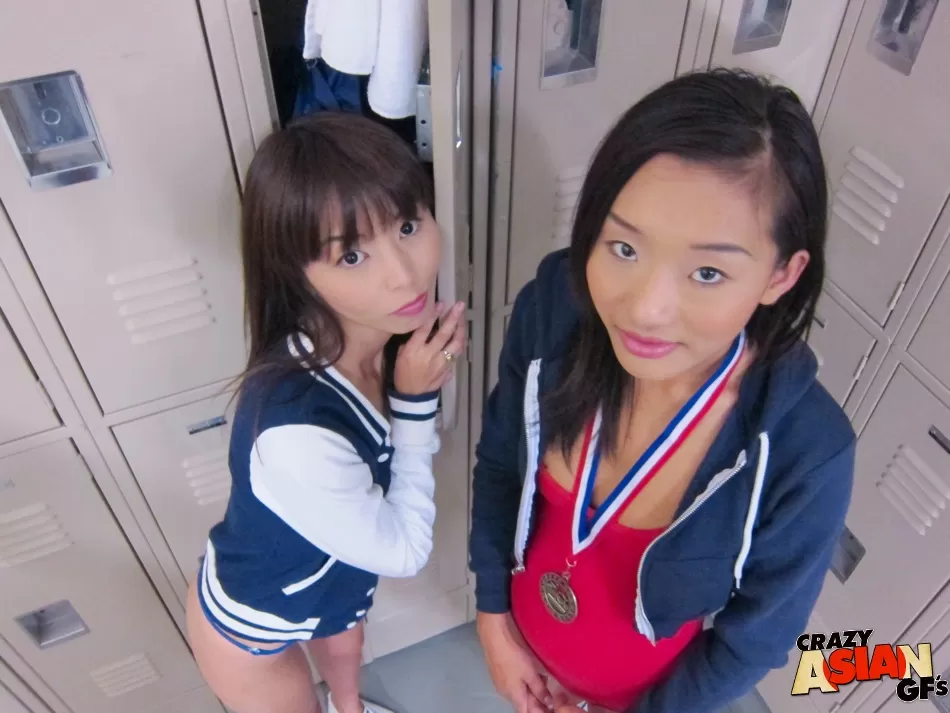 Молодая азиатка-любительница Алина Ли и ее подруга сверкают плоскими грудями в раздевалке