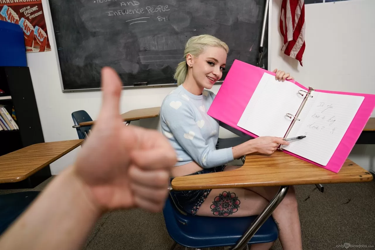 Молодая студентка-блондинка дает своему учителю отлизать мячик прямо в классе