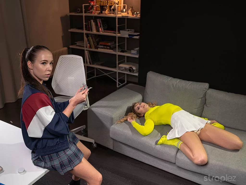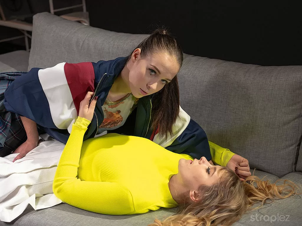 Молодые лесбиянки Кейси Норман и Ната Оушен борются на диване