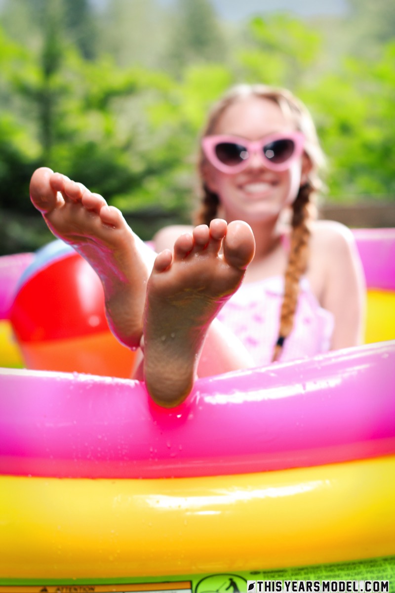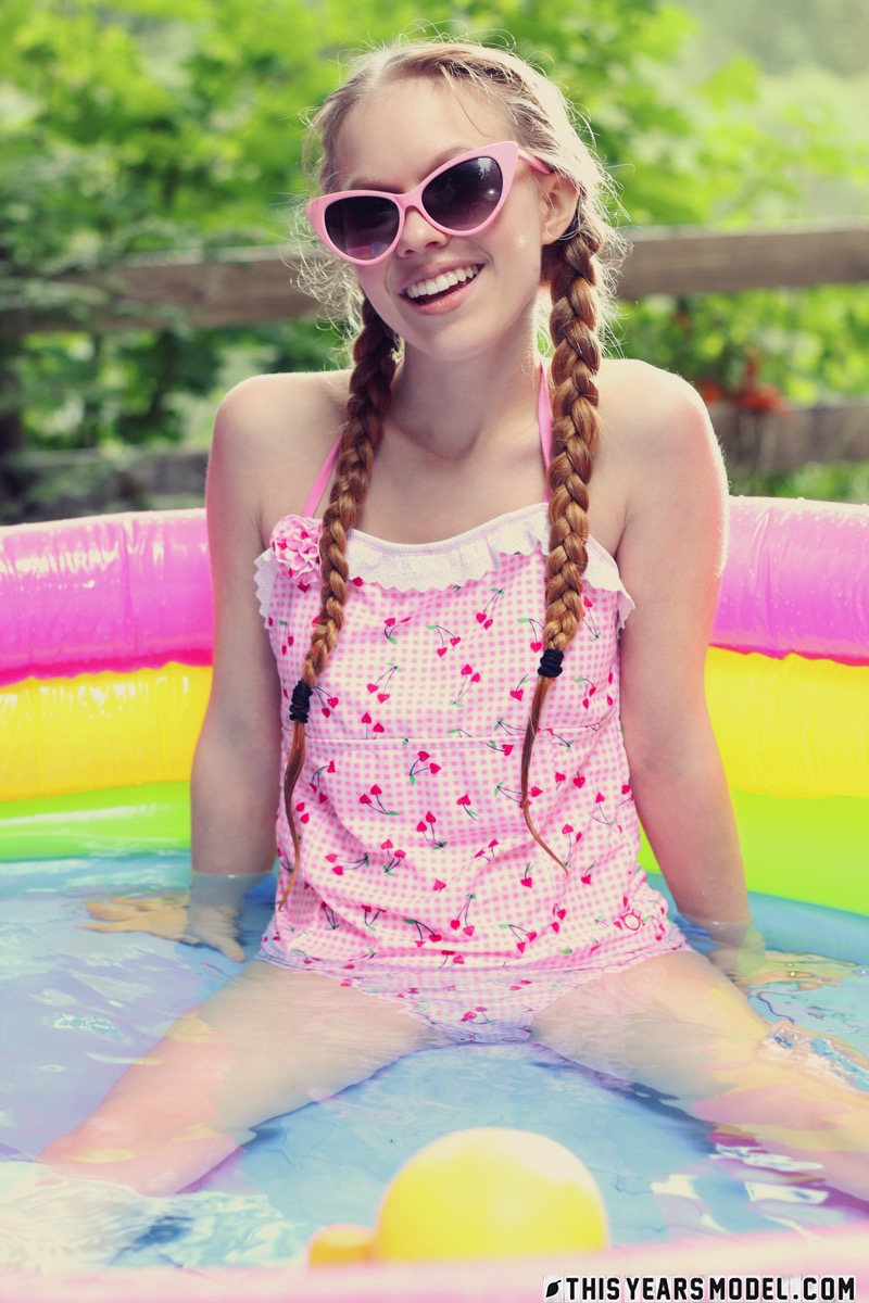 Очаровательная молоденькая Долли Литтл дергает себя за заплетенные косички в надувном бассейне