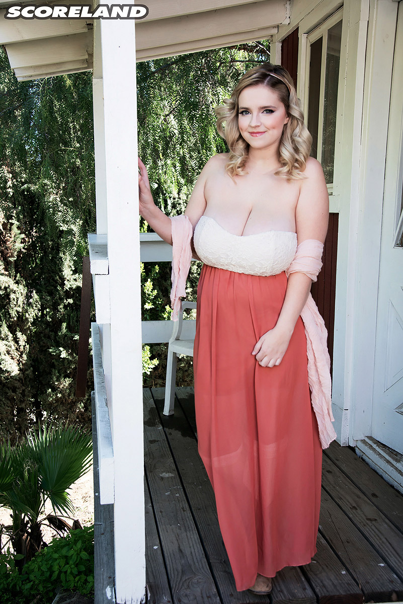 Полная одинокая девушка Коди Вор раздевается, чтобы снять носки и ботинки на веранде