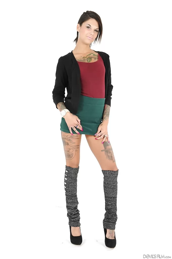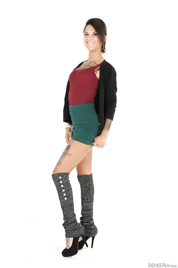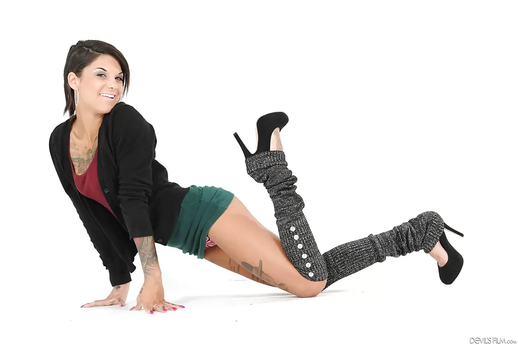 Потрясающая красотка Бонни Роттен позирует в чулках и показывает сиськи