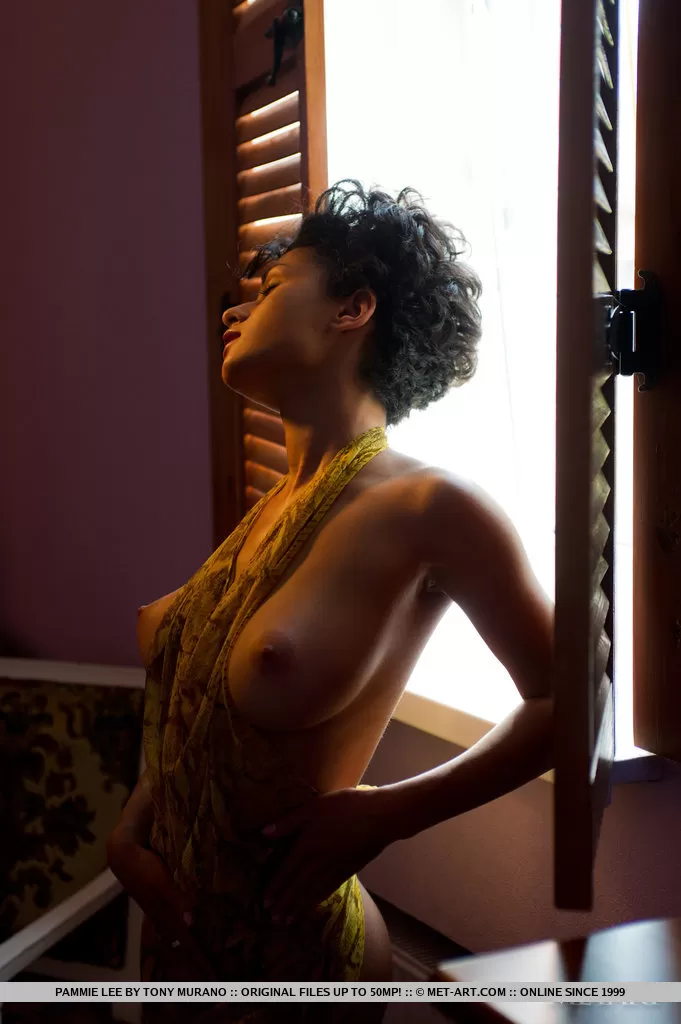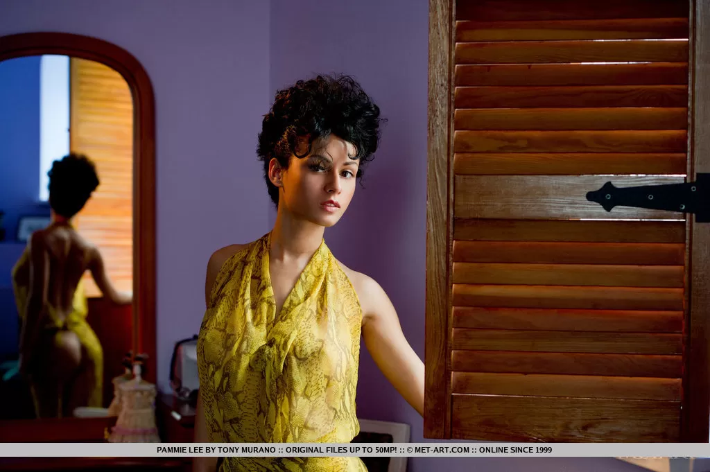Противная шлюха Пэмми Ли снимает платье, чтобы показать свою горячую волосатую киску крупным планом