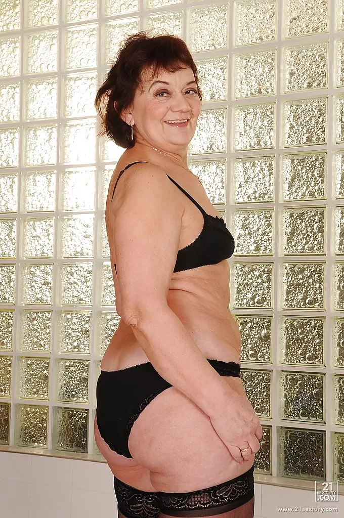 Распутная бабуля в чулках раздевается догола и показывает волосатую киску
