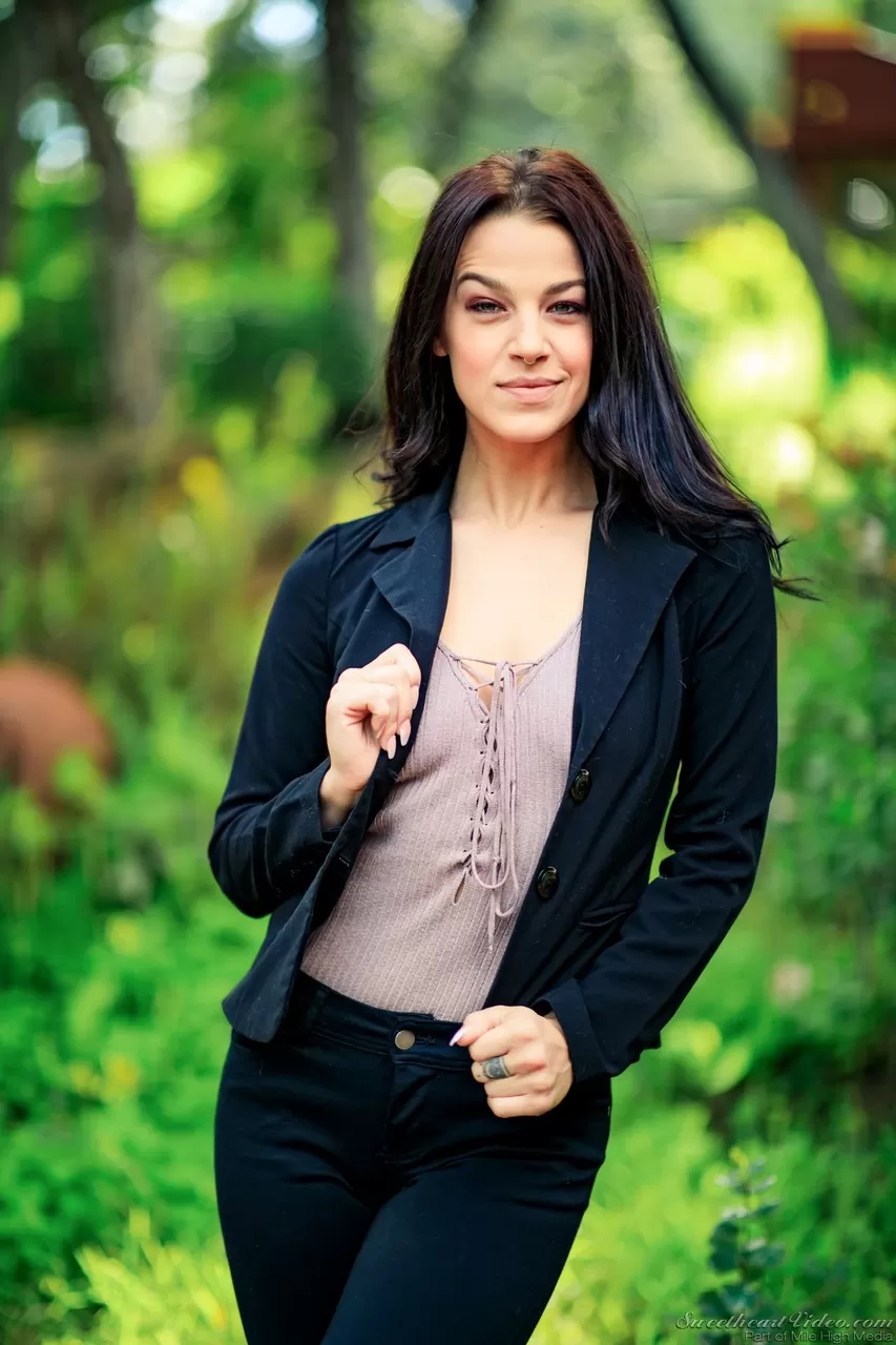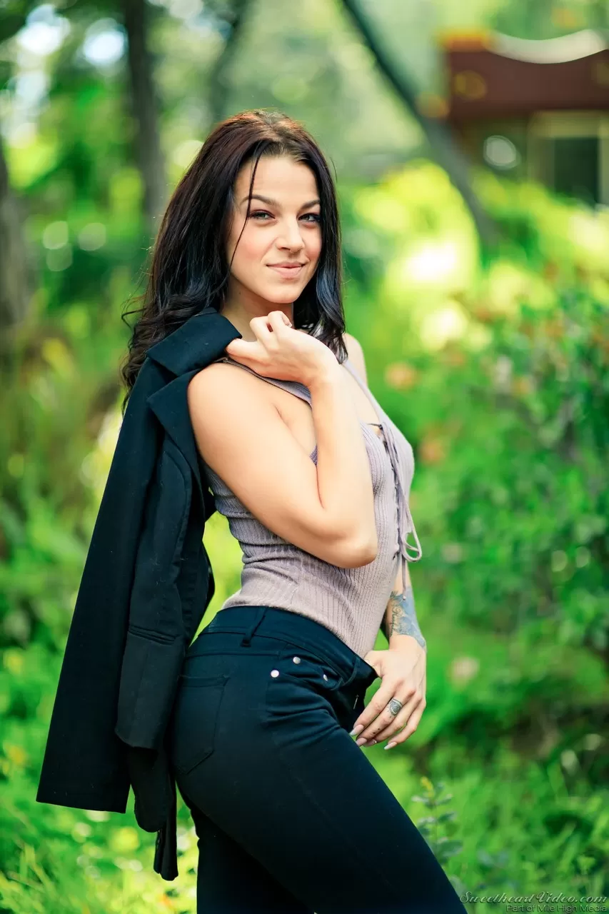 Сексуальная брюнетка Эвелин Стоун исполняет стриптиз на тропинке среди природы