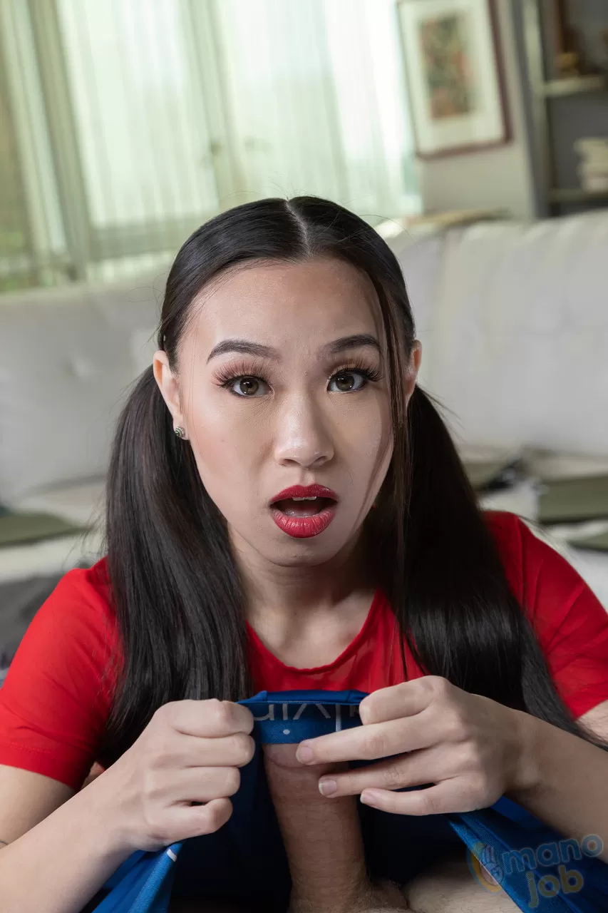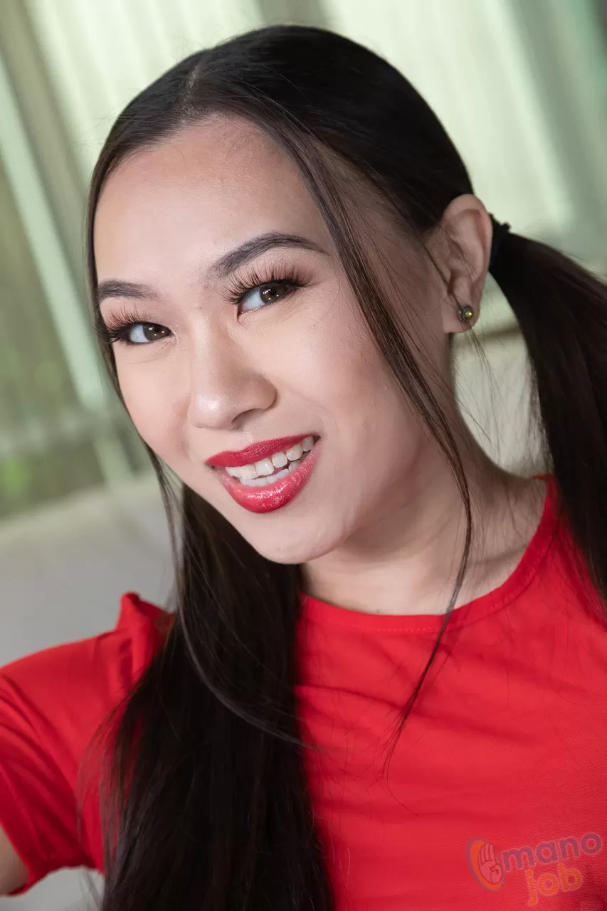 Симпатичная азиатка с длинными косичками раздевается, чтобы оседлать член