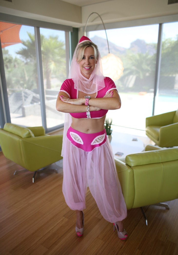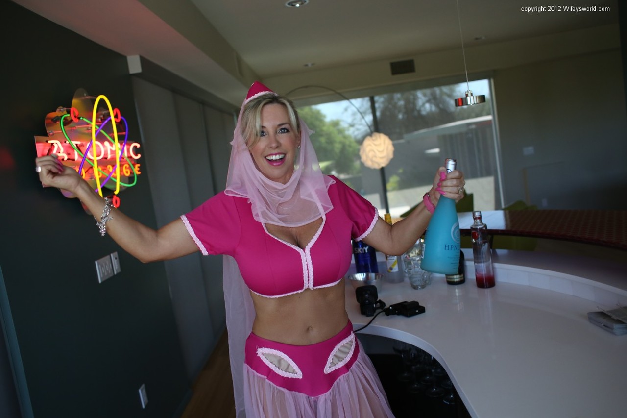Симпатичная блондинка домохозяйка освобождает свои сиськи от наряда Джини