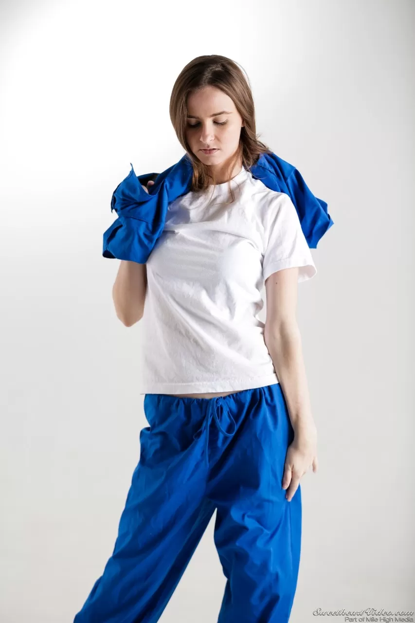 Сольная девушка Джей Тейлор снимает халат и белую футболку, а также трусы, чтобы раздеться догола