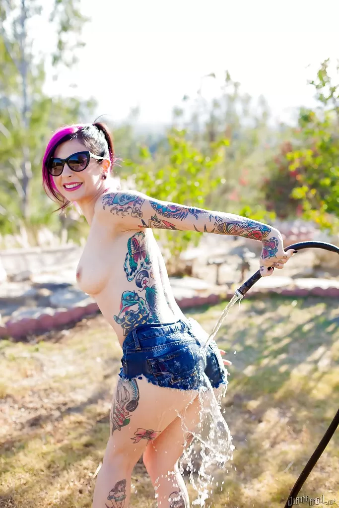 Татуированная любительница Джоанна Энджел смачивает большие сиськи милфы в солнцезащитных очках