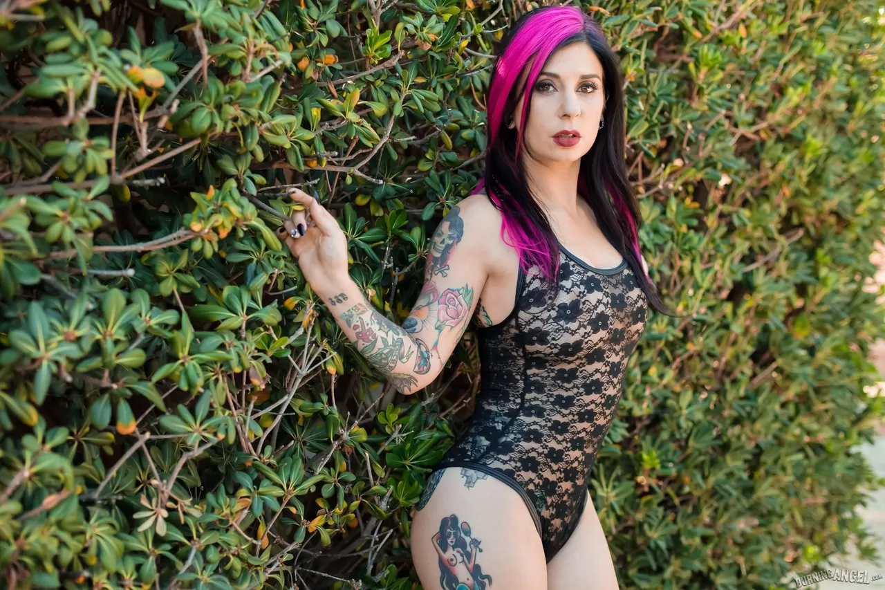 Татуированная соло-модель Джоанна Энджел раздевается перед кустами на улице