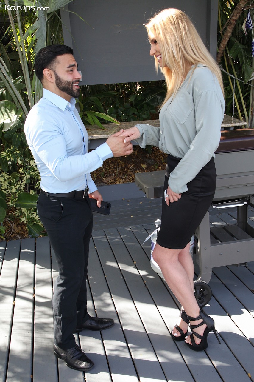 Высокая блондинка Рэйчел Кавалли соблазняет своего друга-мужчину в черной юбке и на каблуках