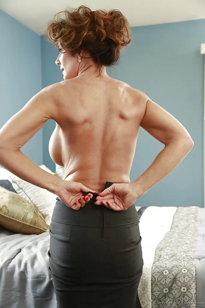 Зрелая красотка с огромными круглыми сиськами раздевается и раздвигает ноги